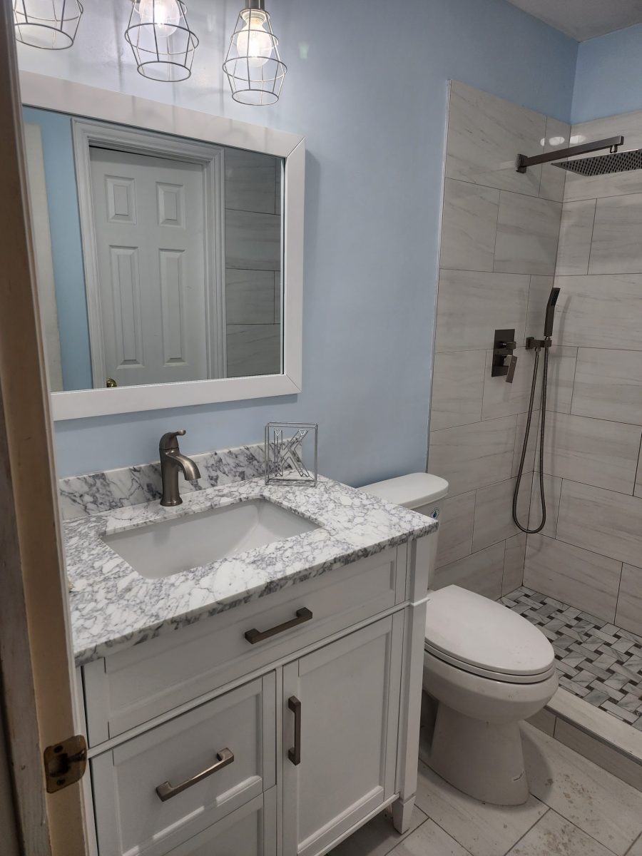 Providing a fresh new look for both bathrooms started with demoing both bathrooms. Re-configuring the master bathroom to get better use of the space allowed to put a larger walk-in shower with a dual showerhead including a rain shower. Installing a custom shower pan and larger tiles to meet the homeowners request turned out awesome. The shower looks amazing as does the rest of the bathroom. A fresh new look !